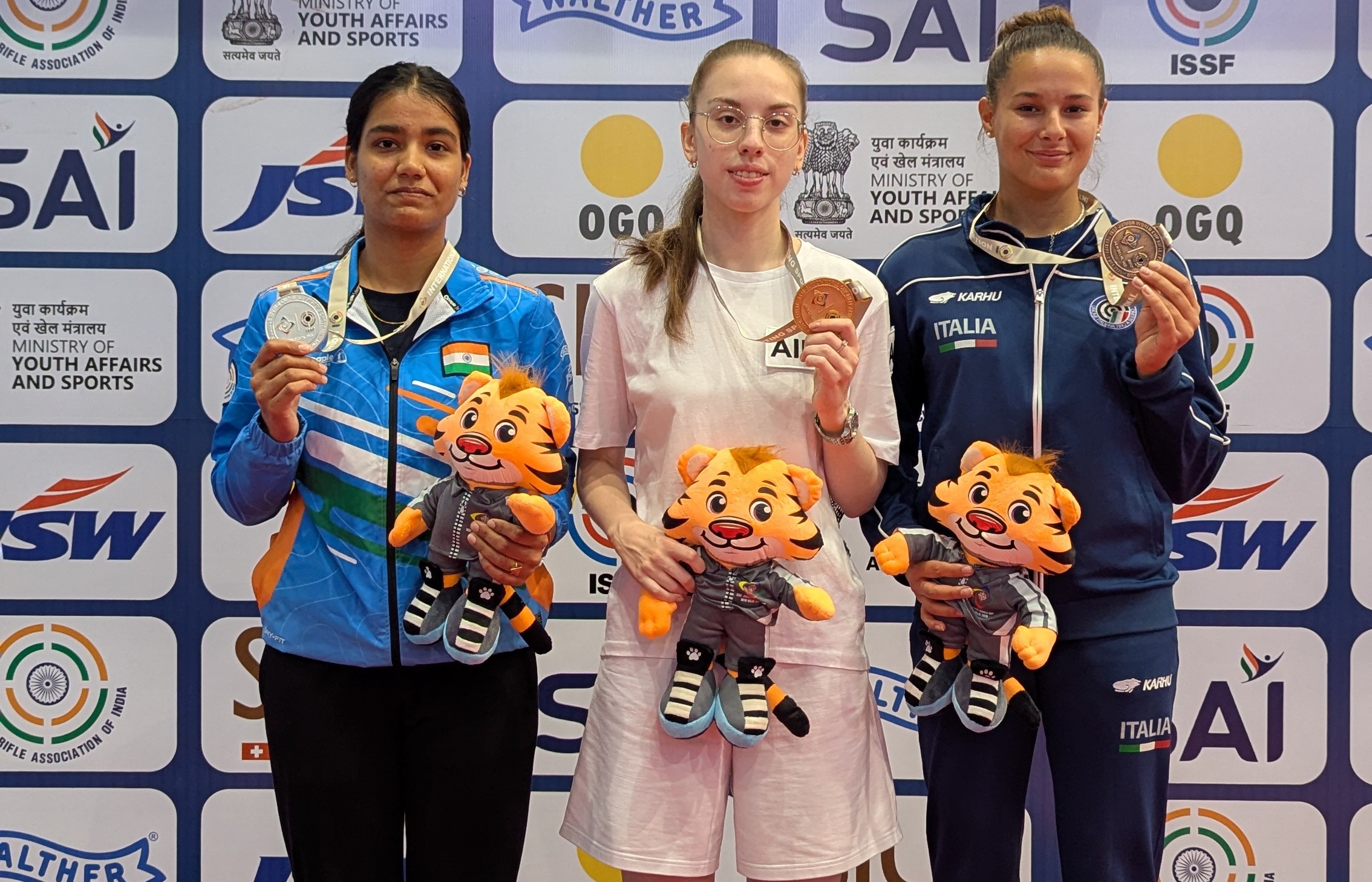 Alessandra Fait of Italy, who at one point looked good to get gold, ended with bronze with 28 leaving Tejaswini and Aleksandra Tikhonova fight for gold.