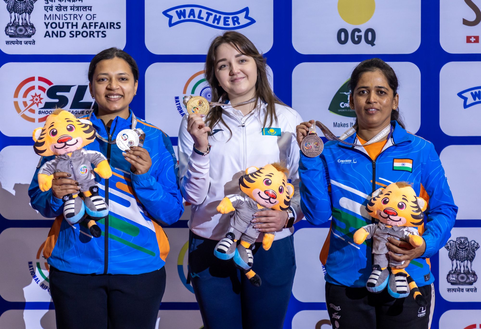 Yelizaveta Bezrukova of Kazakhstan (centre), Sift Kaur Kamra (left) and Tejaswini Sawant